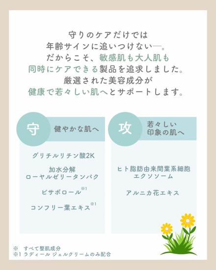 数多くの肌トラブルに 日々向き合うエステティシャンの声から 誕生した「ラディール」。 守りのケアだけでは 肌の年齢サインに対応しきれない。 そんな課題に直面し、 敏感肌も大人肌も同時にケアできる 製品を追求いたしました。 「繊細な肌を持つ方にも確かなケアを届けたい」 現場の想いを形にした “次世代のケアシリーズ”が誕生いたしました。